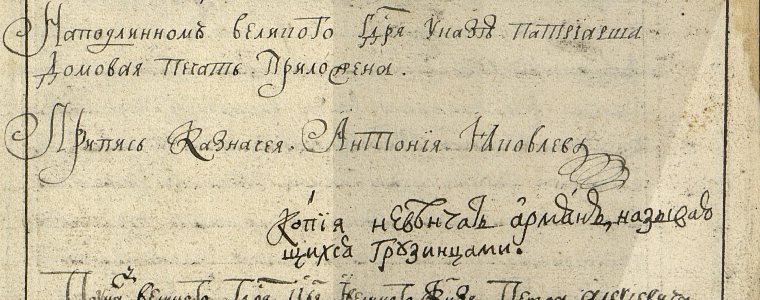 Припись Казначея Антонія Іаковлева копія невѣнчать армянъ называющихся Грꙋзинцами.